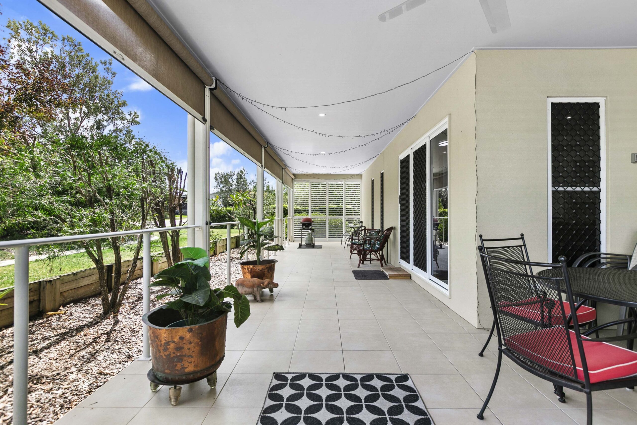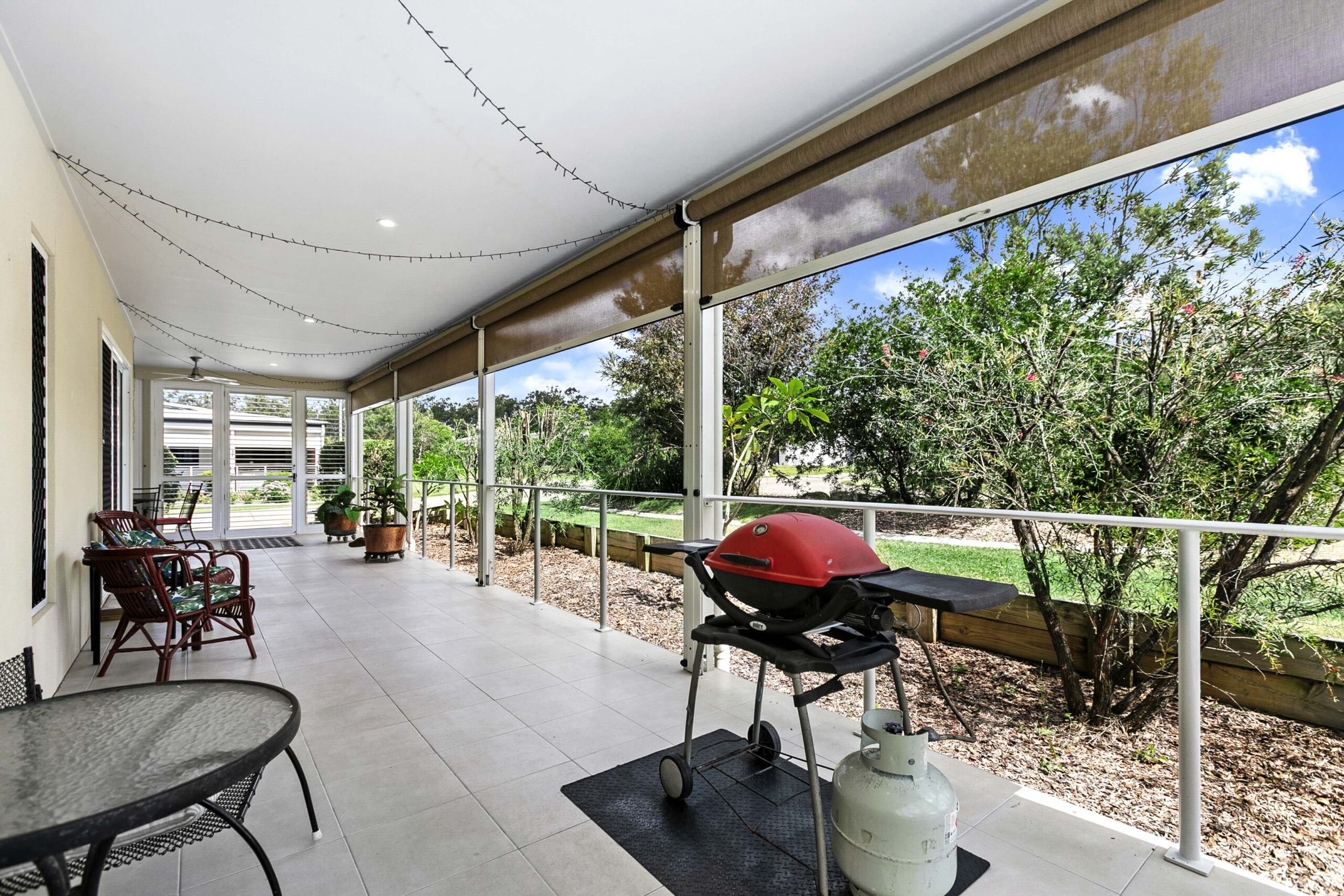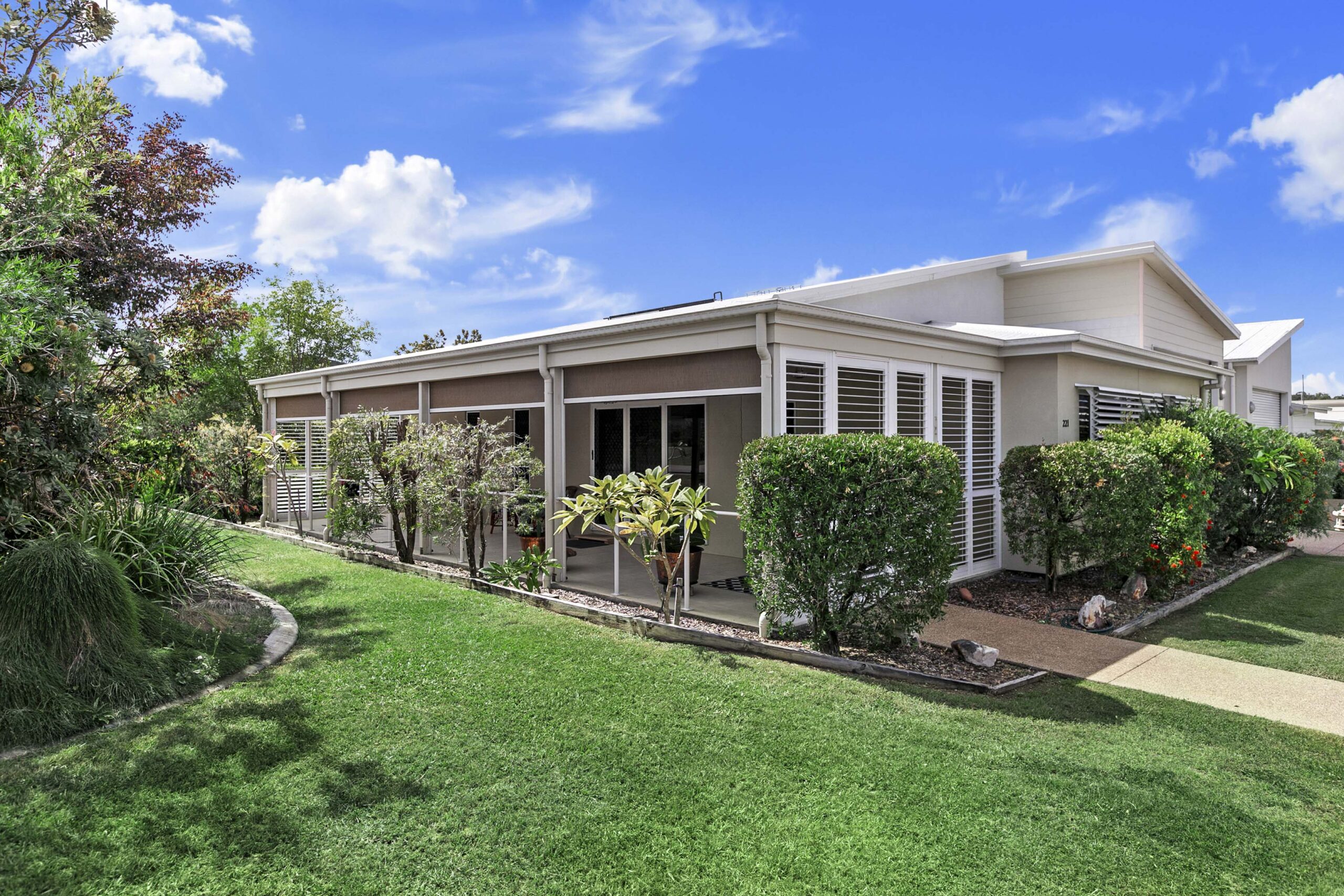 Stepping into Home 221, you are welcomed by a level entry that opens onto a wide tiled patio stretching the full length of the home. Pull‑down blinds create a sheltered outdoor room with shutters installed at either end , offering a peaceful spot to relax in all seasons.