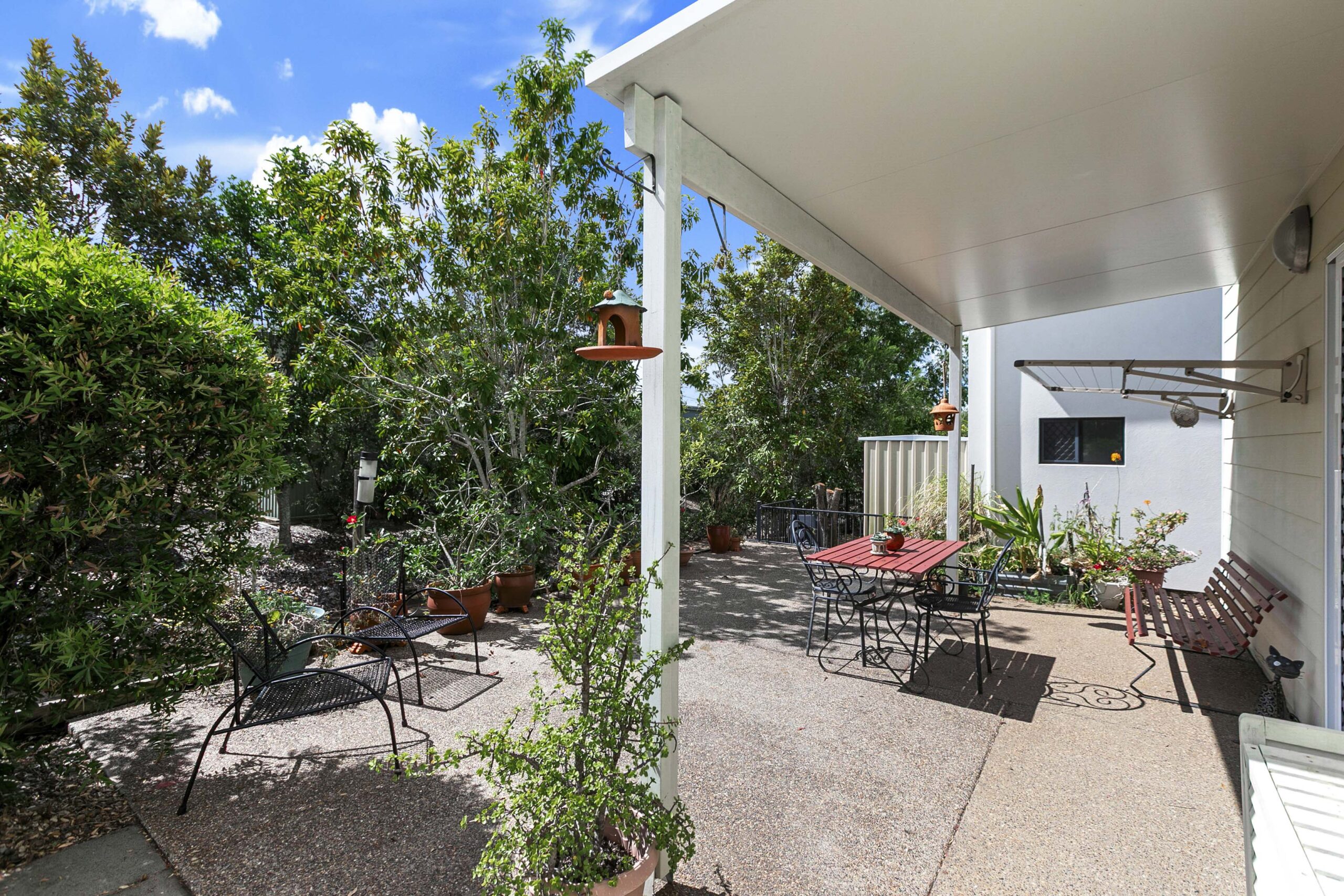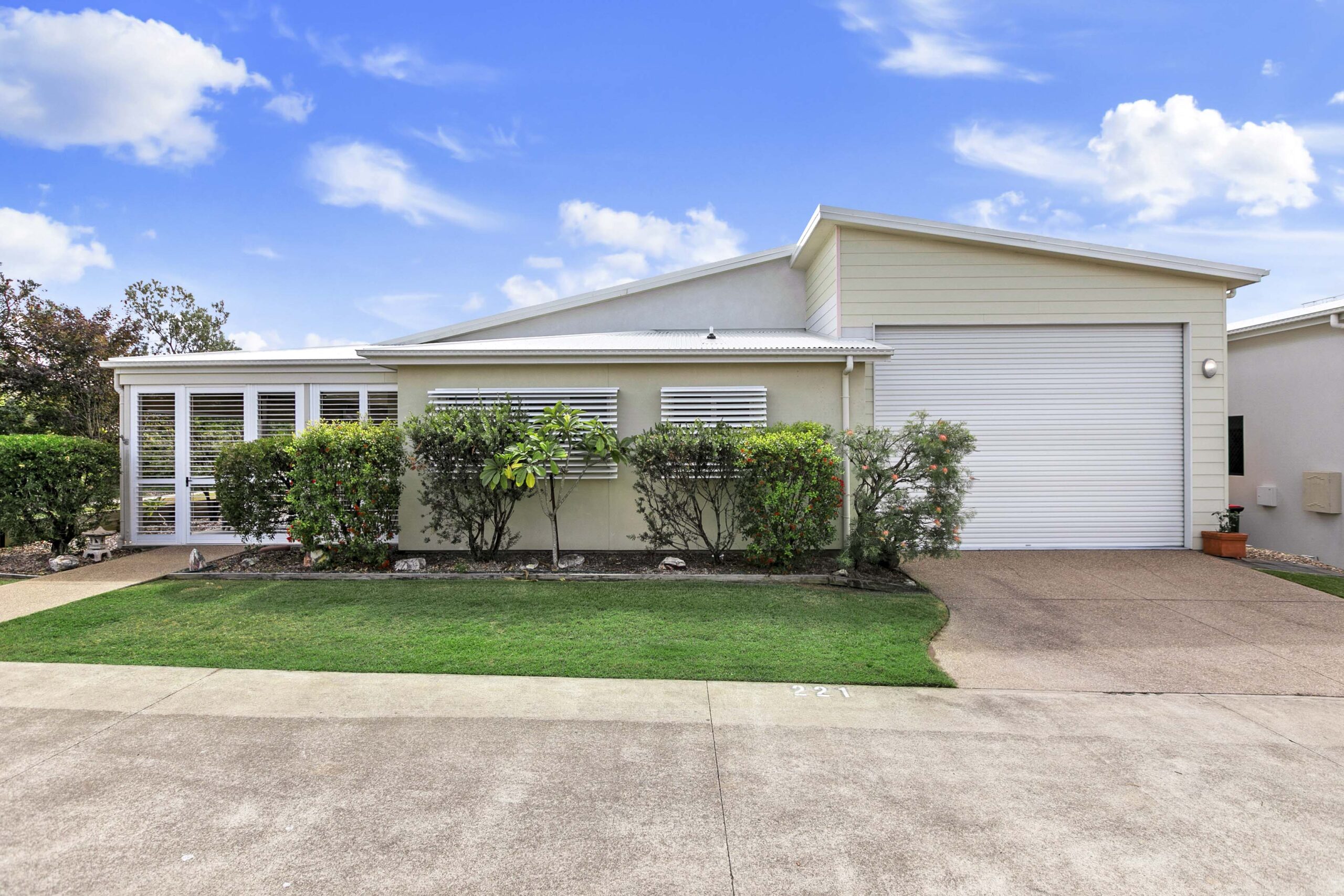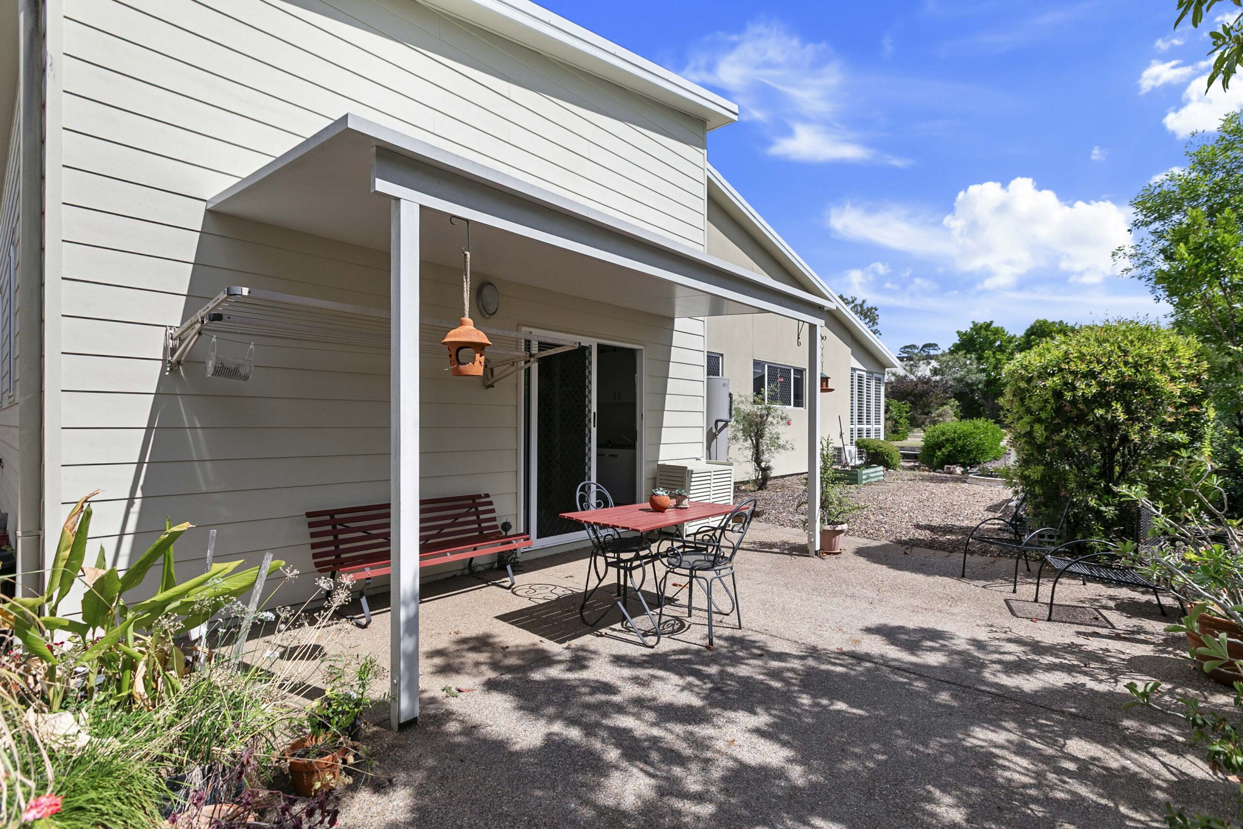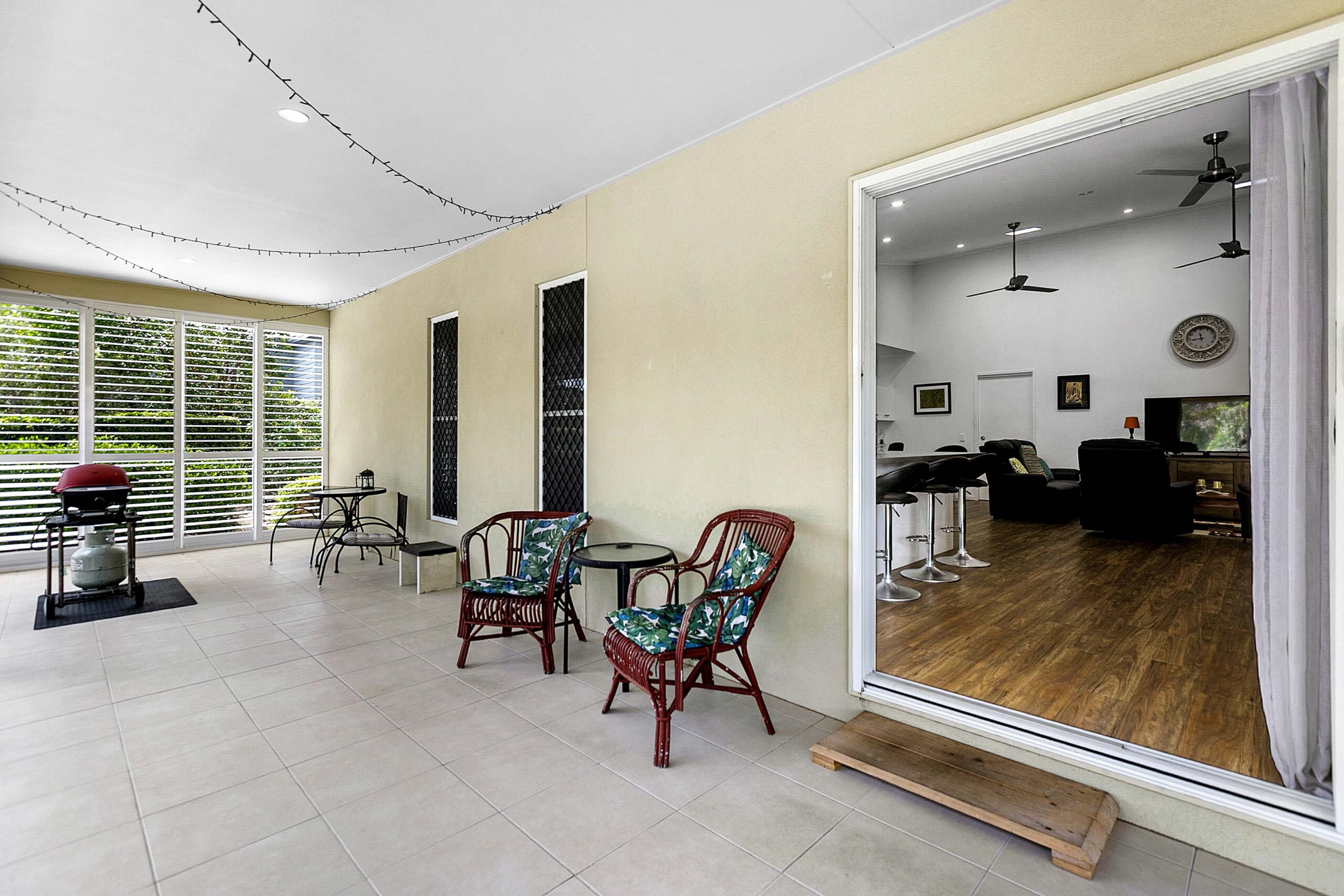 Stepping into Home 221, you are welcomed by a level entry that opens onto a wide tiled patio stretching the full length of the home. Pull‑down blinds create a sheltered outdoor room with shutters installed at either end , offering a peaceful spot to relax in all seasons.