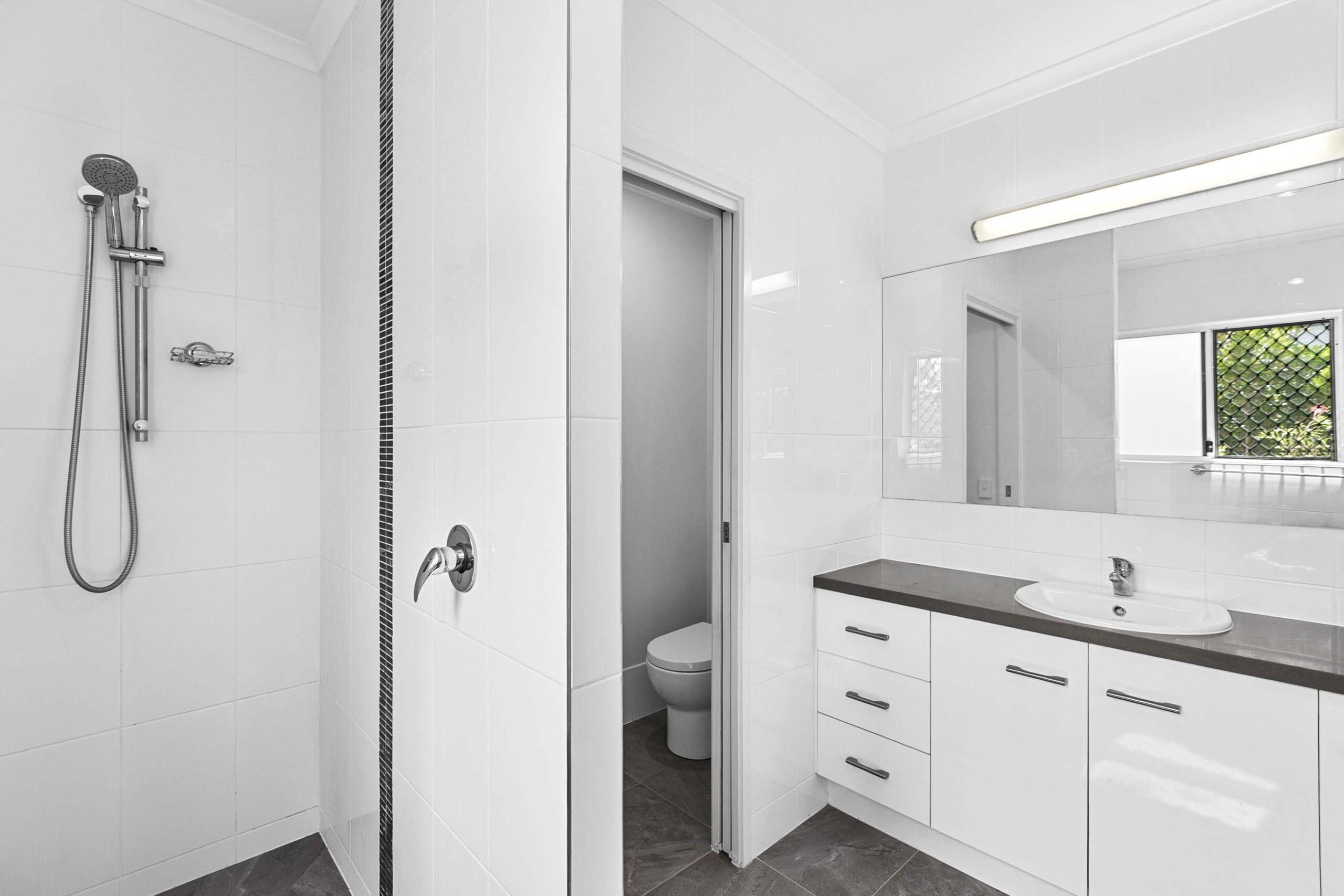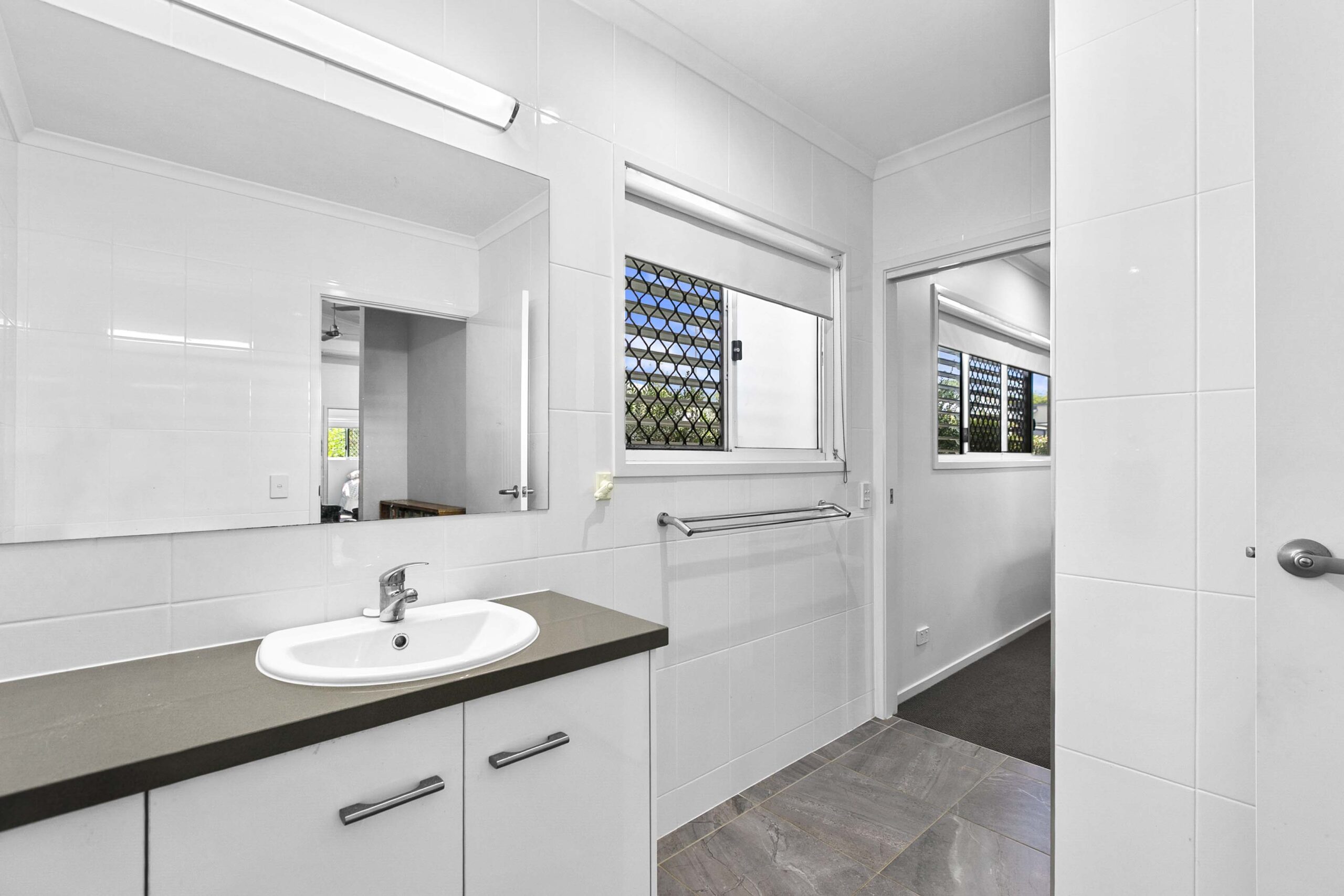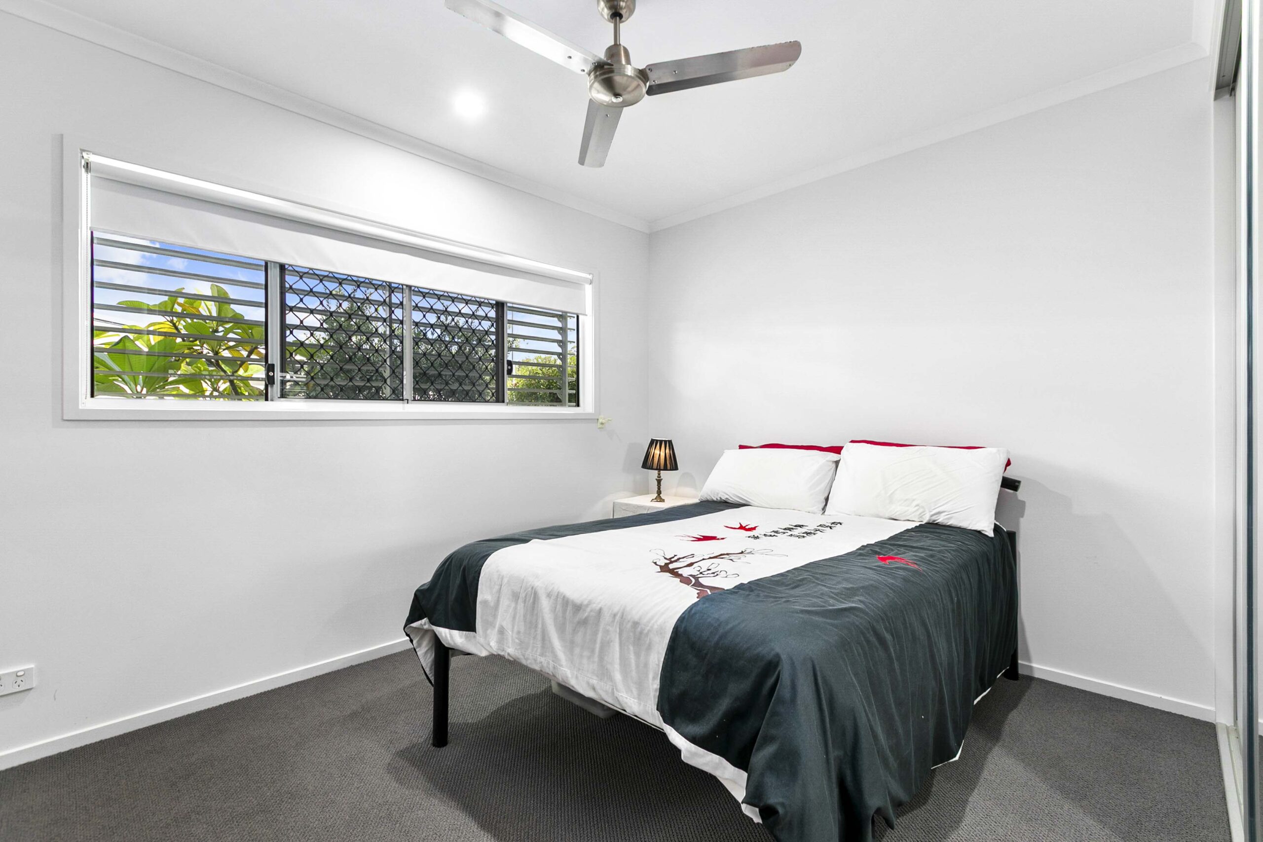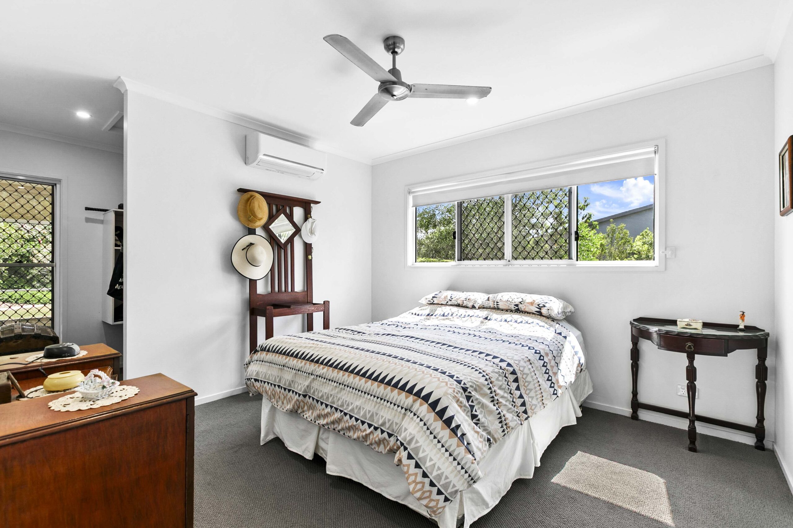 Both bedrooms feature soft carpet underfoot and ceiling fans, while Bedroom 1 includes a split‑system air conditioner, walk‑in robe and ensuite for added convenience. Bedroom 2 has direct access to the second bathroom.