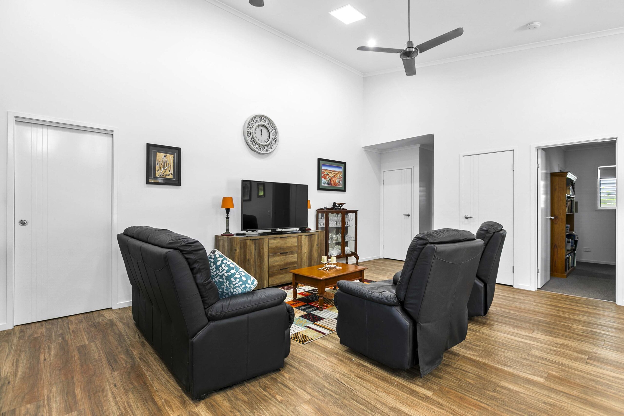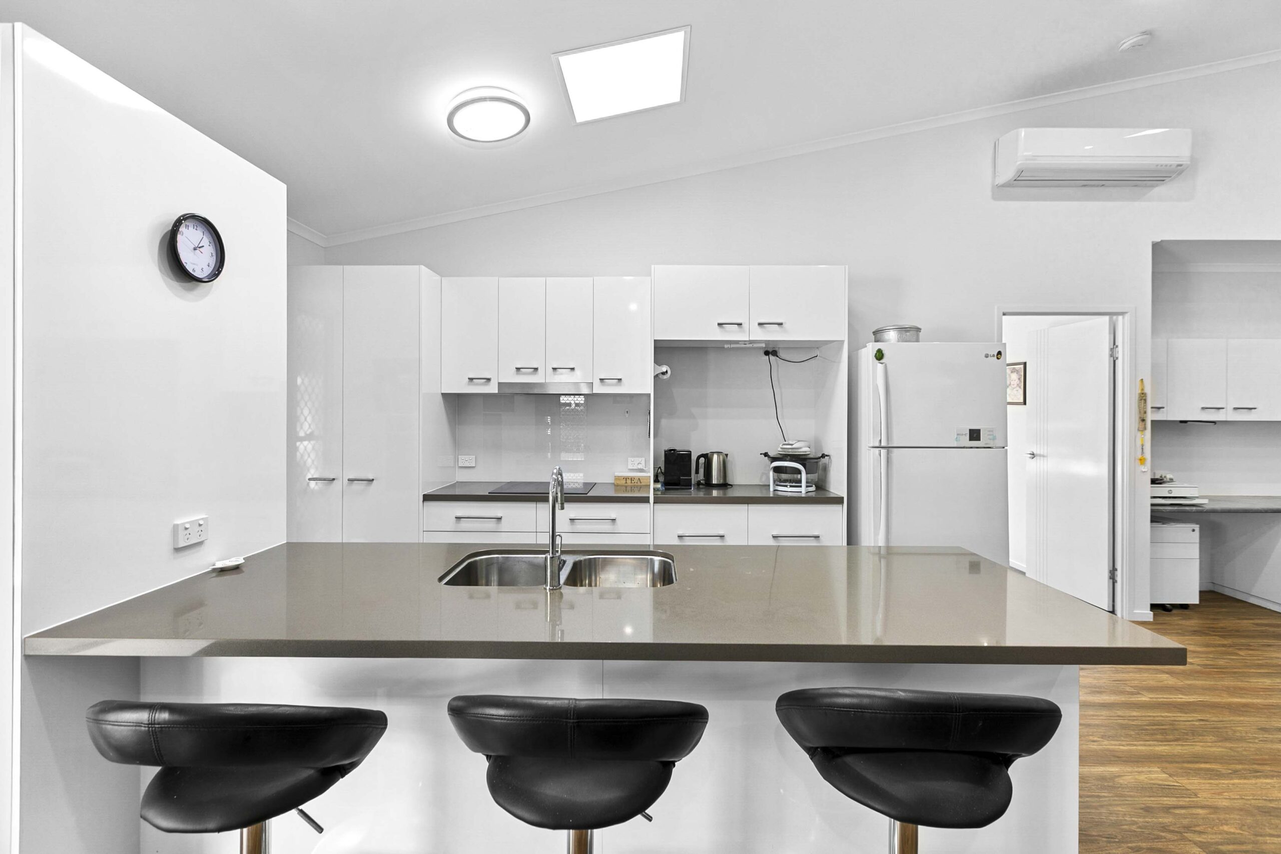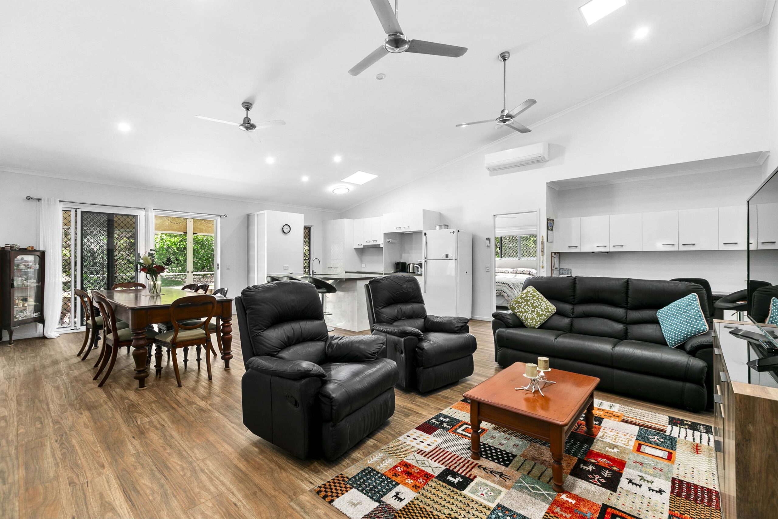 A generous open lounge and dining area with air‑conditioning ensures year‑round comfort. Modern vinyl planking flows through the main living spaces, and both bathrooms feature easy‑access walk‑in showers.