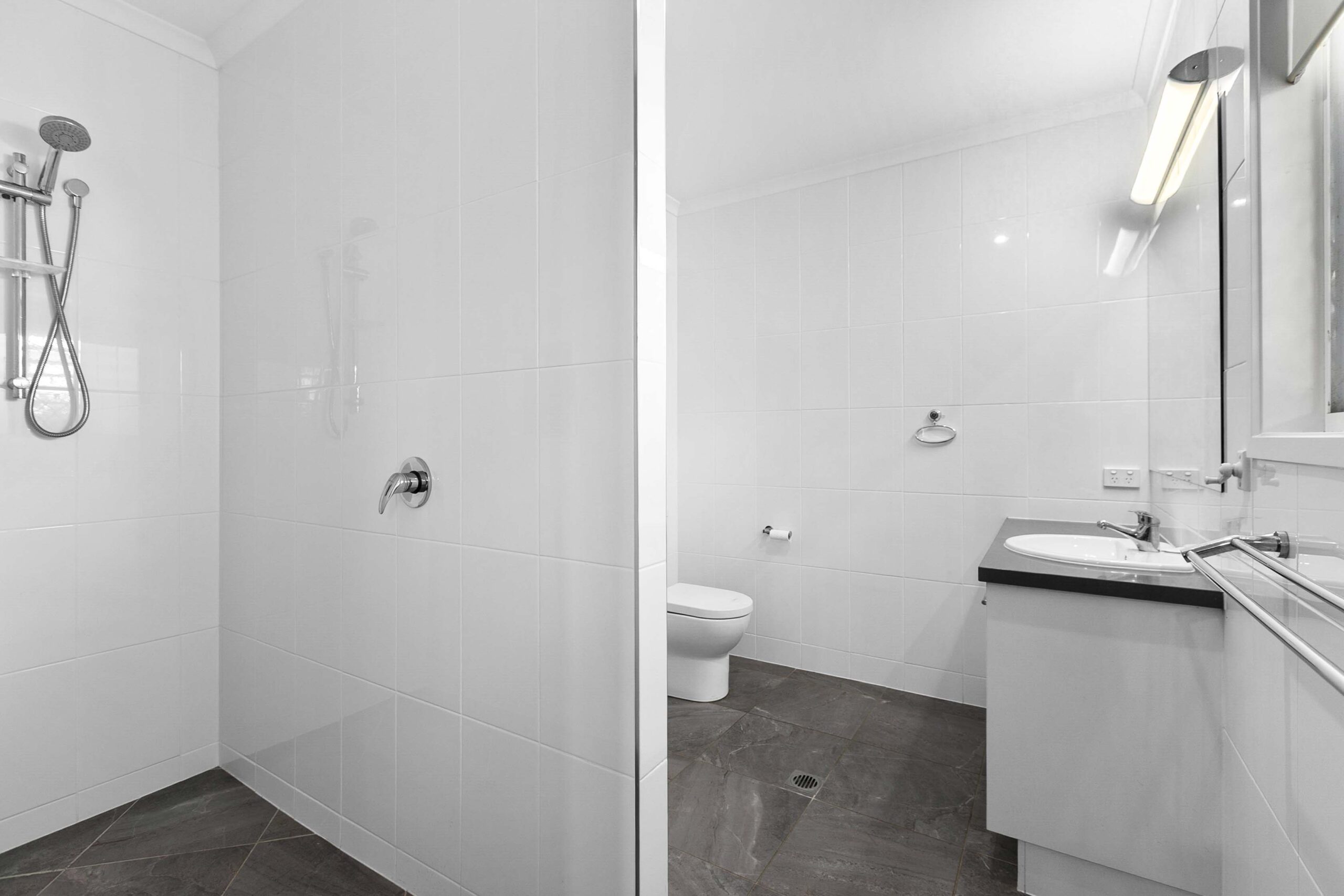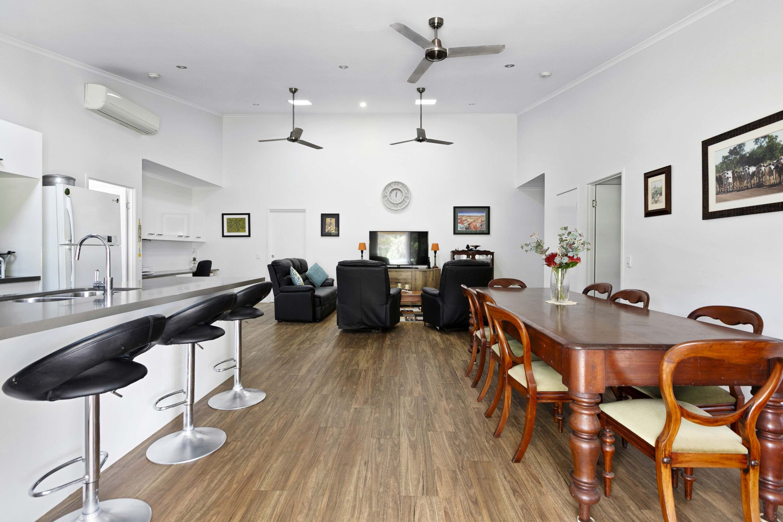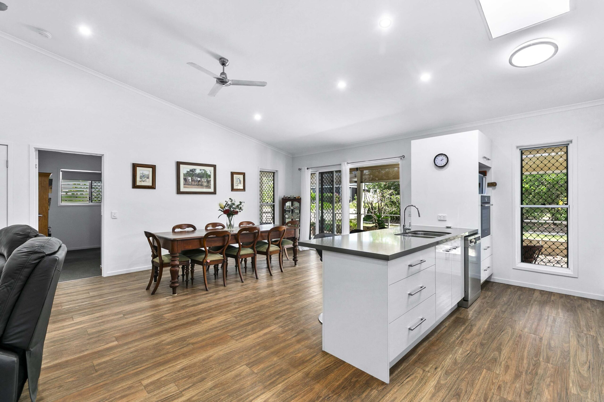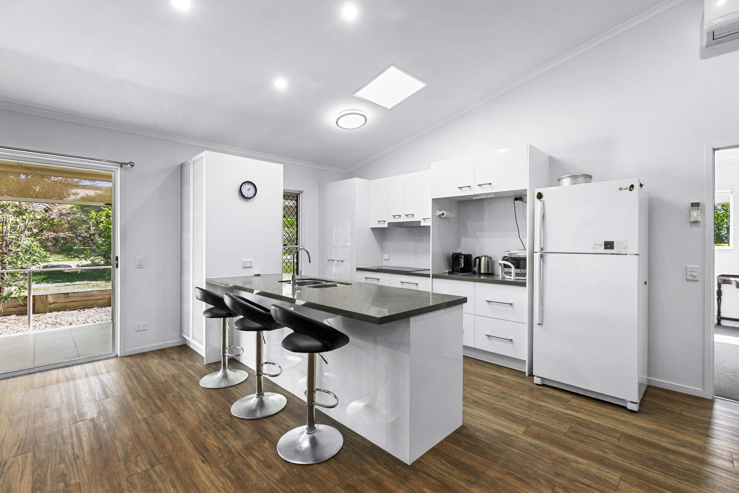 A generous open lounge and dining area with air‑conditioning ensures year‑round comfort. Modern vinyl planking flows through the main living spaces, and both bathrooms feature easy‑access walk‑in showers.